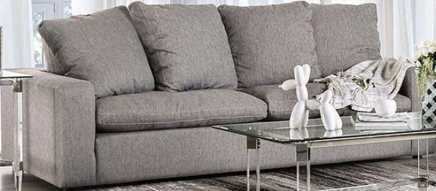 Upgrade your living room with the classic comfort of this contemporary sofa from the Acamar Collection. The gray linen-like fabric is stuffed full of plush cushioning, creating an inviting, dreamy appeal that spills over with coziness. Bring home this splash of class to your home with luxurious appeal and intimate comfort your guests will appreciate!