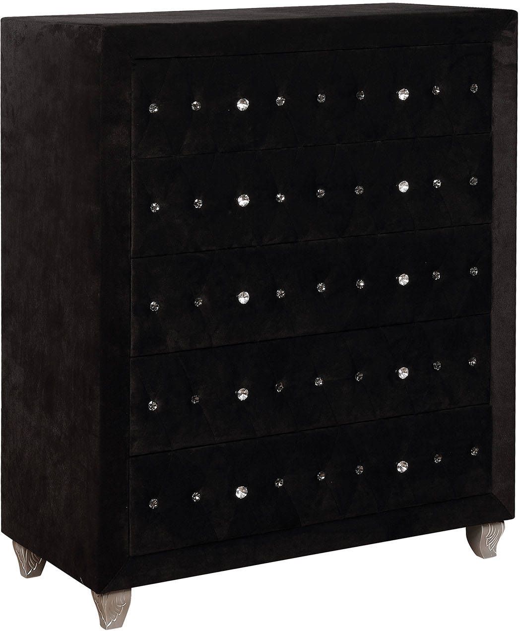 Comforting cushioned flannelette encompasses this bedroom chest. Admire the glimmering acrylic button tufts, run your hands over the soothing fabric, and easily stock essentials in their cavernous storage drawers. Cabriolet feet add a well polished finished as they provide unwavering support to this elegant piece.