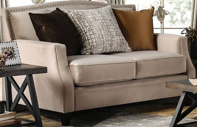 When someone refers to the lap of luxury they can be referring to your living room. This gorgeous love seat is draped in a soft velveteen-like fabric that is smooth to the touch. Your guest will be enamored by the neutral color palette and flashy throw pillows that add a hint of shine and complement the nailhead trim.