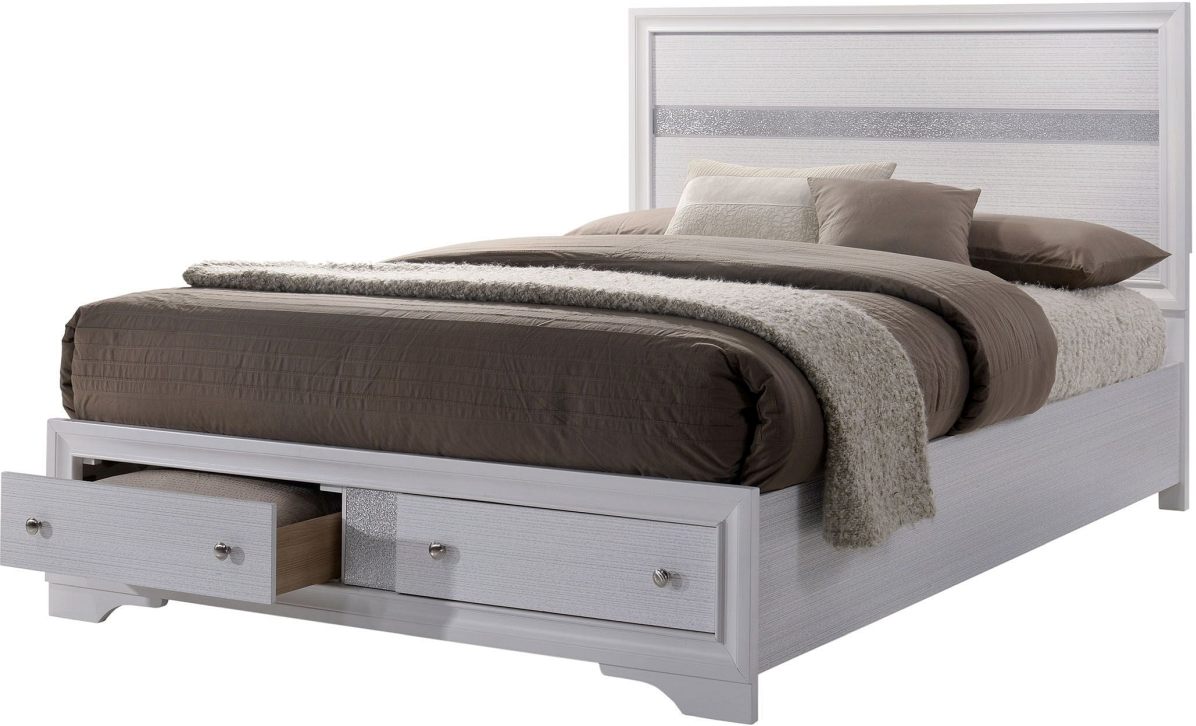 Brighten your room with the sheen and shine that this bedroom set delivers. The gleaming white finishes promote a refreshingly clean aesthetic with silver lines that glisten in any light. Silver tone pulls detail the case goods brilliantly, offering an easy grasp to the one-of-a-kind jewelry drawers. Store fresh bedding in the spacious footboard drawer and conveniently store essentials next to your bedside with the stylish nightstand. Glimmering and glamorous, create the room you have always dreamed of with this stunning styled bedroom set.