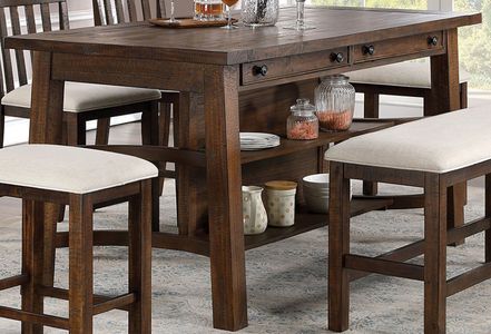 With its earthly rustic oak finish, this counter height table is the epitome of barnyard design excellence. The solid wood table features a unique curved under-storage and two pairs of drawers with antique hardware. The table top is made of planks, laid out beautifully with its wood grain patterns.Read More
