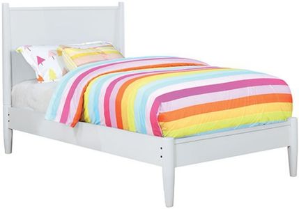 For a quick modern update to your home, this collection will add that trendy mid-century appeal. Featuring a sleek white finish and wooden headboard, this panel bed is complete in a platform style with an included mattress ready slat kit. Coordinating case goods boast slim flared legs and recessed handle drawer pulls. A choice of oval or rectangular wall mountable mirror completes this set.Read More