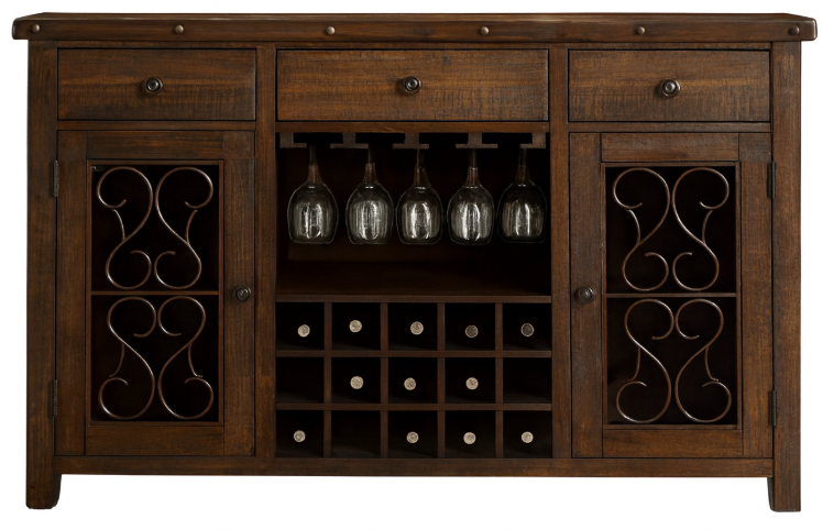 A traditional design with hints of medieval flair, this beautiful dining set features rich hues and ornate details that are perfect for fine dining. The matching server comes paired with stunning metal scrollwork and classic nailhead trim, offering shelves, hanging glassware and a built-in wine rack.Read More