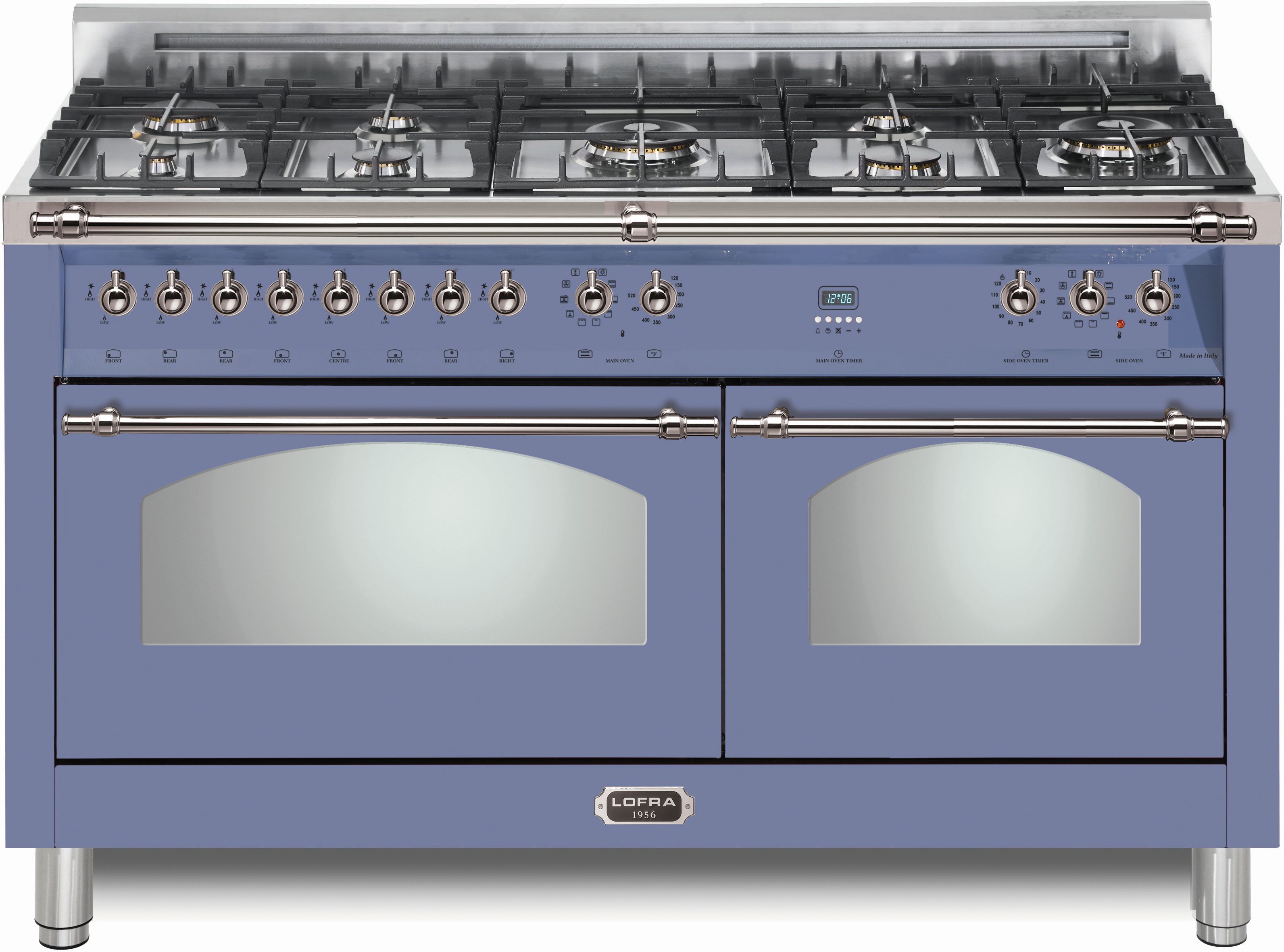 LOFRA® Dolcevita 60" Lavender Pro Style Dual Fuel Range features 8 brass burners and matte black burner caps, ventilated doors with Cooling System Height adjustable stainless steel legs, and a large multifunction convection oven: 9 cooking modes.Read More